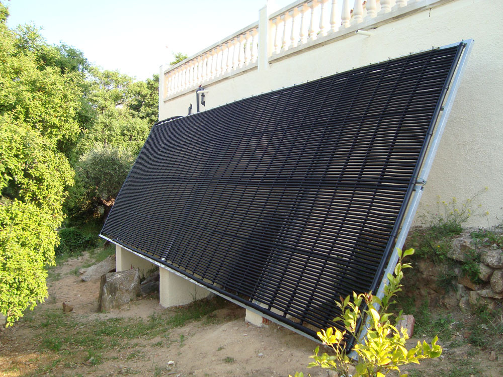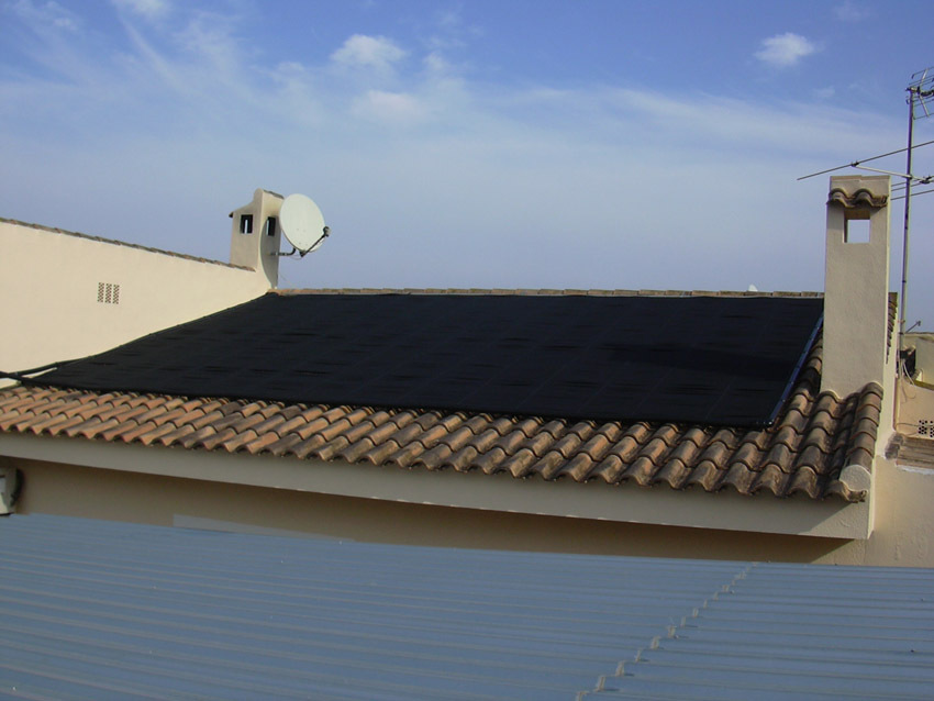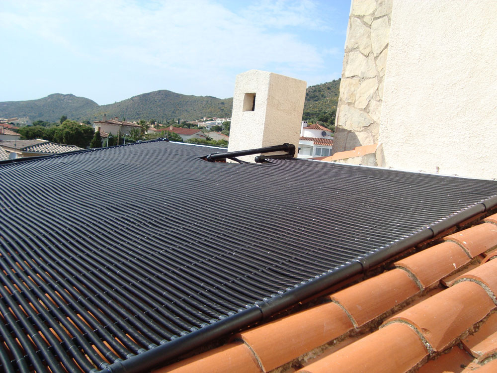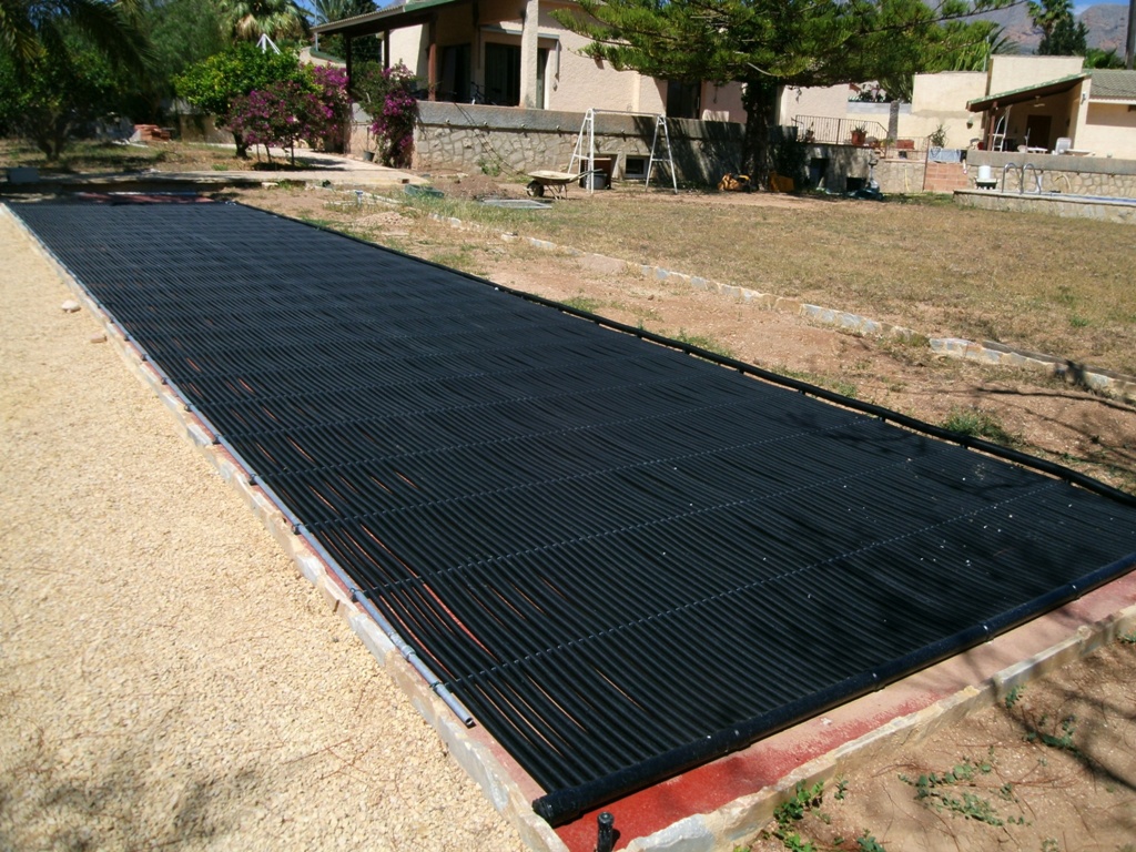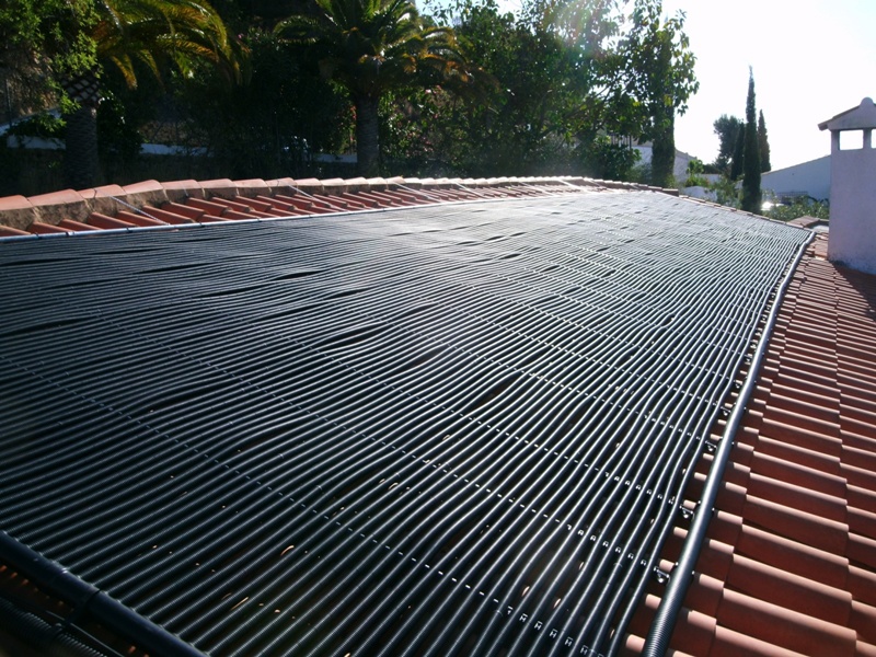 Auf dem spanischen Markt gibt es zahlreiche Typen von Solarkollektoren zur Schwimmbaderwärmung, die natürlich alle gegenüber der Chemie des Schwimmbadwassers und der ultravioletten Strahlung der Sonne resistent sein müssen. Einigen macht weder Schnee noch Eis etwas aus, wie z.B. der Kollektor solar-rapid® des deutschen Herstellers ROOS. Aufgrund der Wellenstruktur des Rippenrohrs wird eine deutlich höhere spezifische Oberfläche als ein glattes Rohr erzielt, wie man es z.B. aus der Bewässerungstechnik kennt. Hier an der Costa Blanca liegt der thermische Effekt dieses Rippenrohrs bei einer Solarstrahlung von 1.700 W/m² bei 91%, d.h. 1.550 W/m².