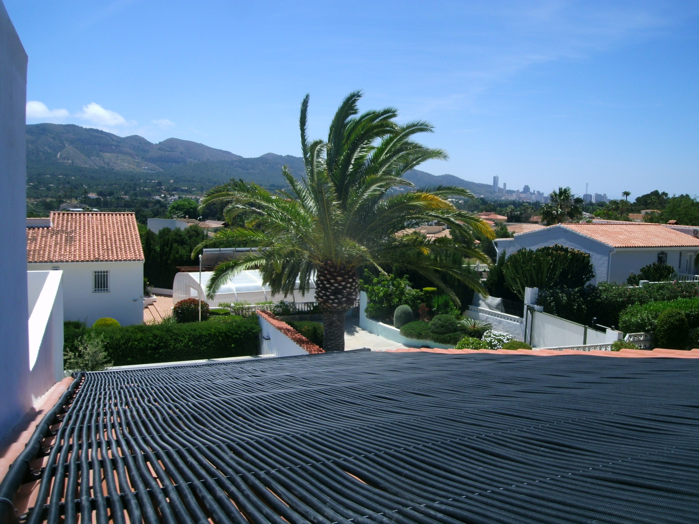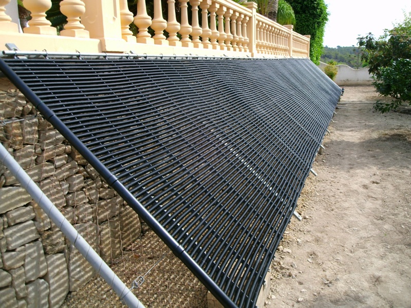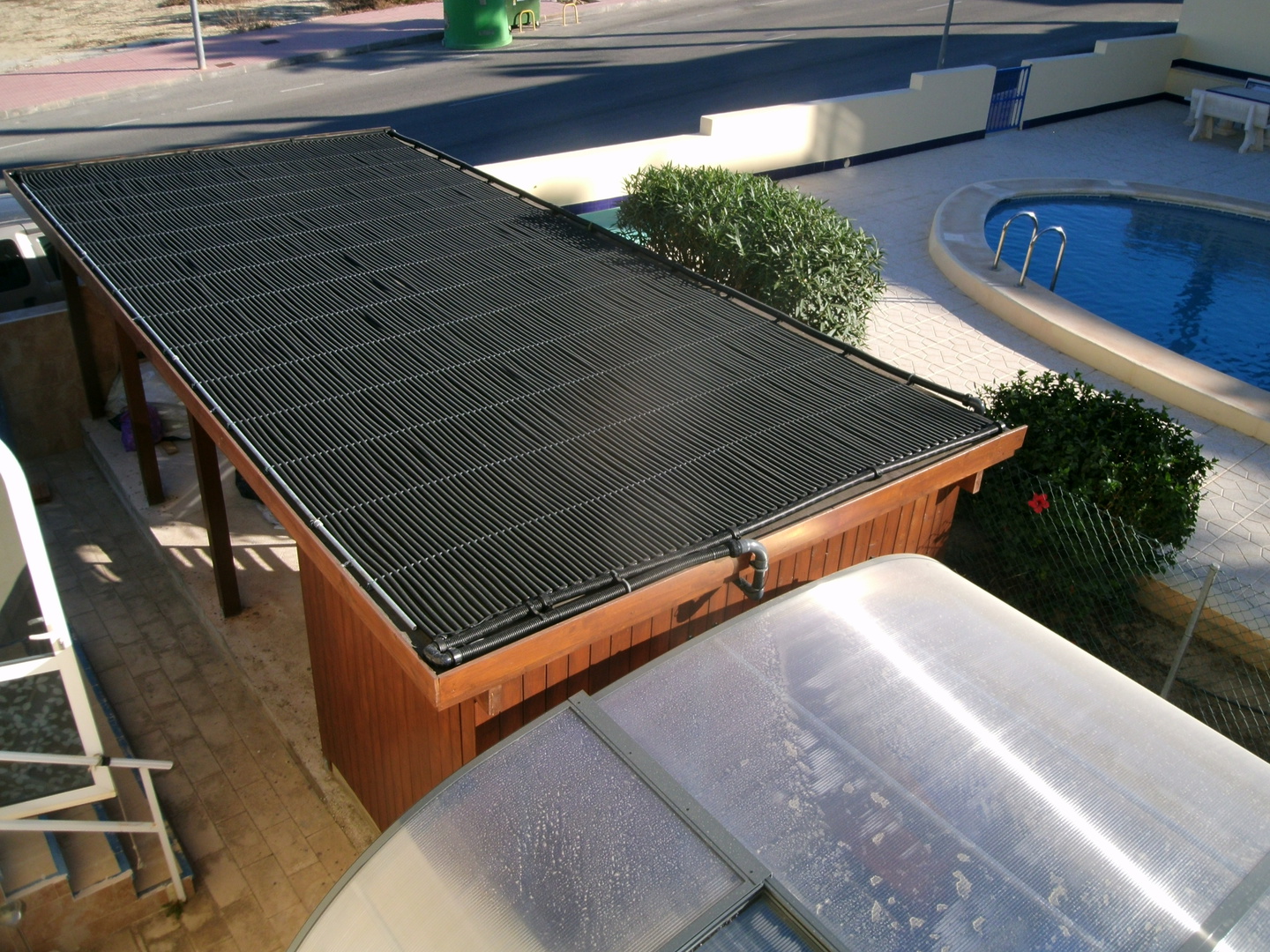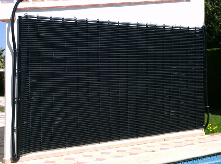 Auf dem spanischen Markt gibt es zahlreiche Typen von Solarkollektoren zur Schwimmbaderwärmung, die natürlich alle gegenüber der Chemie des Schwimmbadwassers und der ultravioletten Strahlung der Sonne resistent sein müssen. Einigen macht weder Schnee noch Eis etwas aus, wie z.B. der Kollektor solar-rapid® des deutschen Herstellers ROOS. Aufgrund der Wellenstruktur des Rippenrohrs wird eine deutlich höhere spezifische Oberfläche als ein glattes Rohr erzielt, wie man es z.B. aus der Bewässerungstechnik kennt. Hier an der Costa Blanca liegt der thermische Effekt dieses Rippenrohrs bei einer Solarstrahlung von 1.700 W/m² bei 91%, d.h. 1.550 W/m².